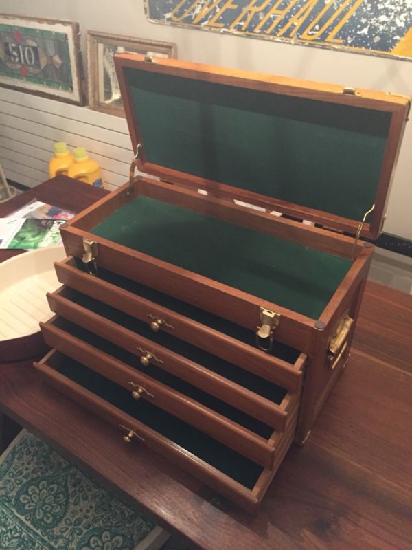 Title (ebay affiliate link): OAK MACHINIST TOOL CHEST WITH FELT LINED DRAWERS BRASS HARDWARE 21L X 10D X 13H