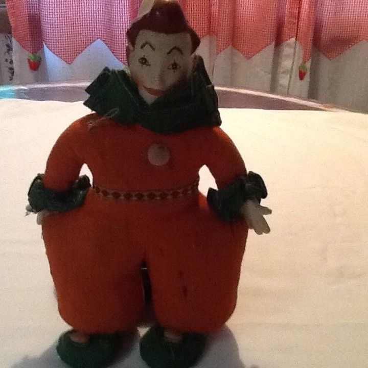 Title (ebay affiliate link): Antique Vintage Bisque Head Toy, Straw Stuffed Clown Doll.