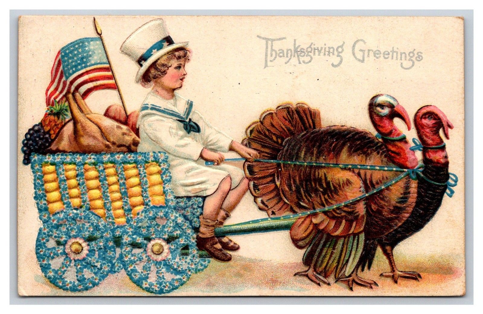 1910 Postcard Thanksgiving Greetings turkeys, cart, flag, patriotic boy