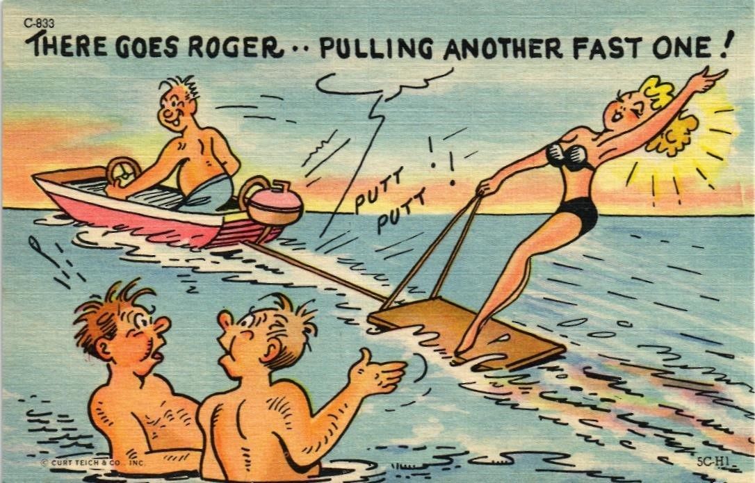 Title (ebay affiliate link): DR JIM STAMPS US ROGER PULLING FAST ONE WATER SKI LINEN COLORTONE COMIC POSTCARD