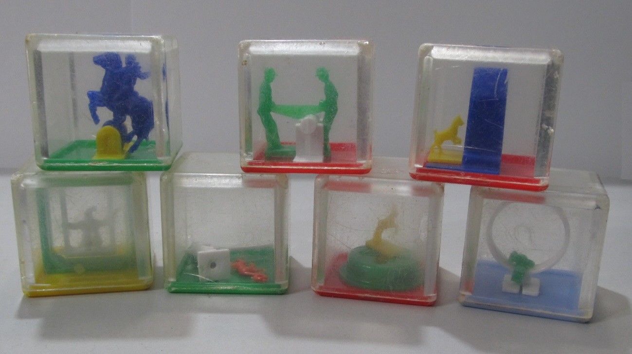 LOT of SEVEN Vintage Clear Plastic Children''s Action Puzzle Blocks Moving Parts