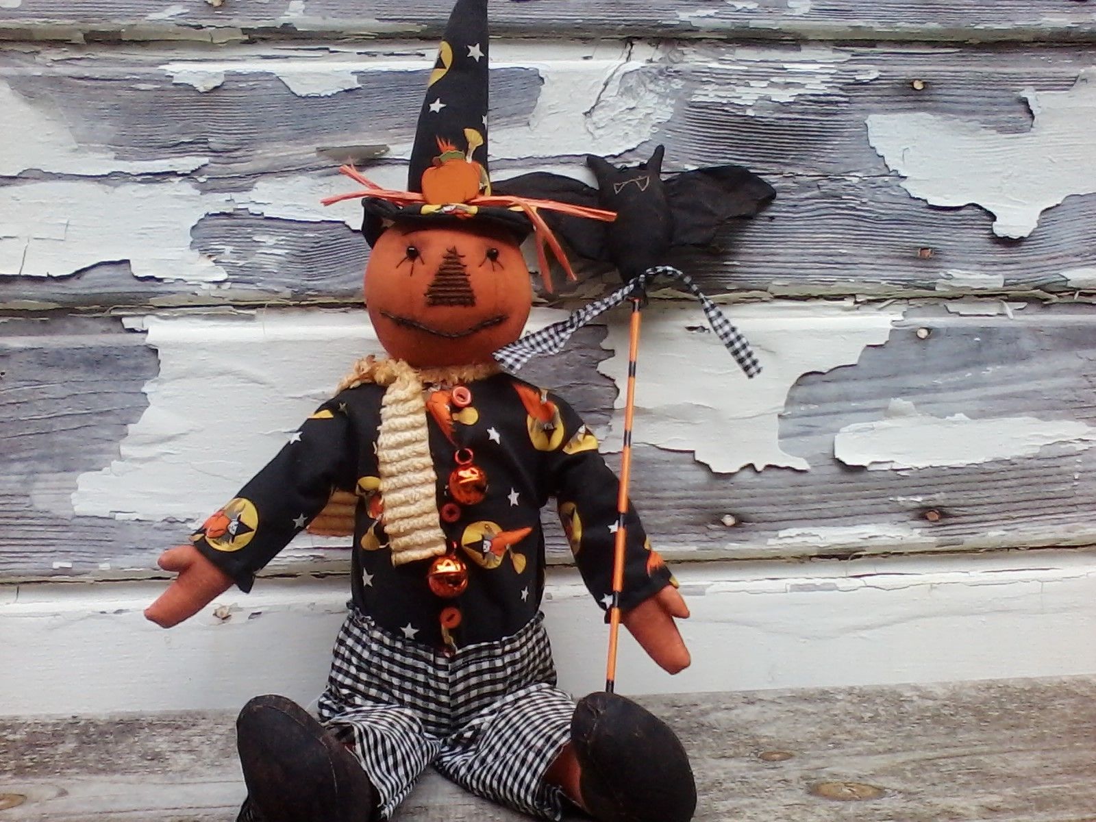 Title (ebay affiliate link): Primitive Halloween Brownish Orange Witch Pumpkin Doll Shelf Sitter Decor