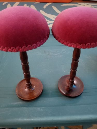 Title (ebay affiliate link): VINTAGE PAIR WOOD & VELVET HAT STAND WIG HOLDER FREDERICK FOX MILLNER TO QUEEN