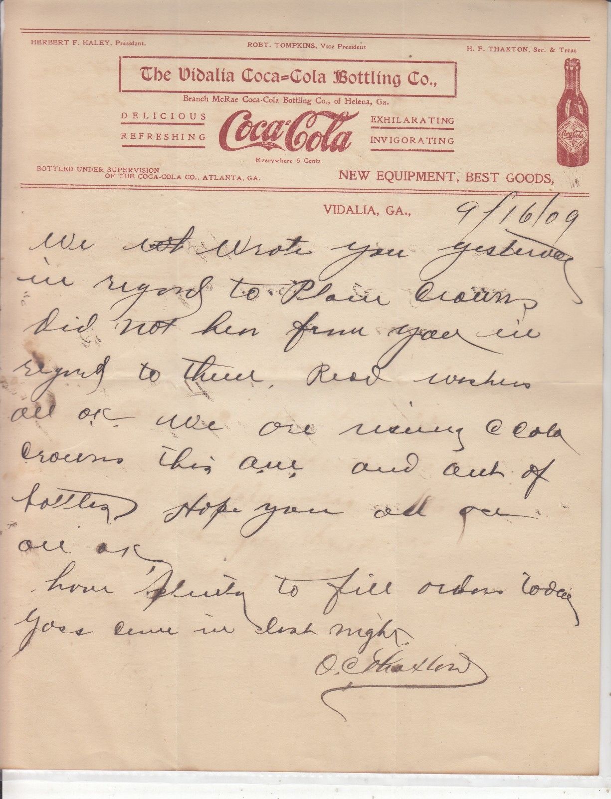 Title (ebay affiliate link): THE VIDALIA COCA-COLA BOTTLING CO.LETTERHEAD DATED 9/16/09 109 YEARS OLD