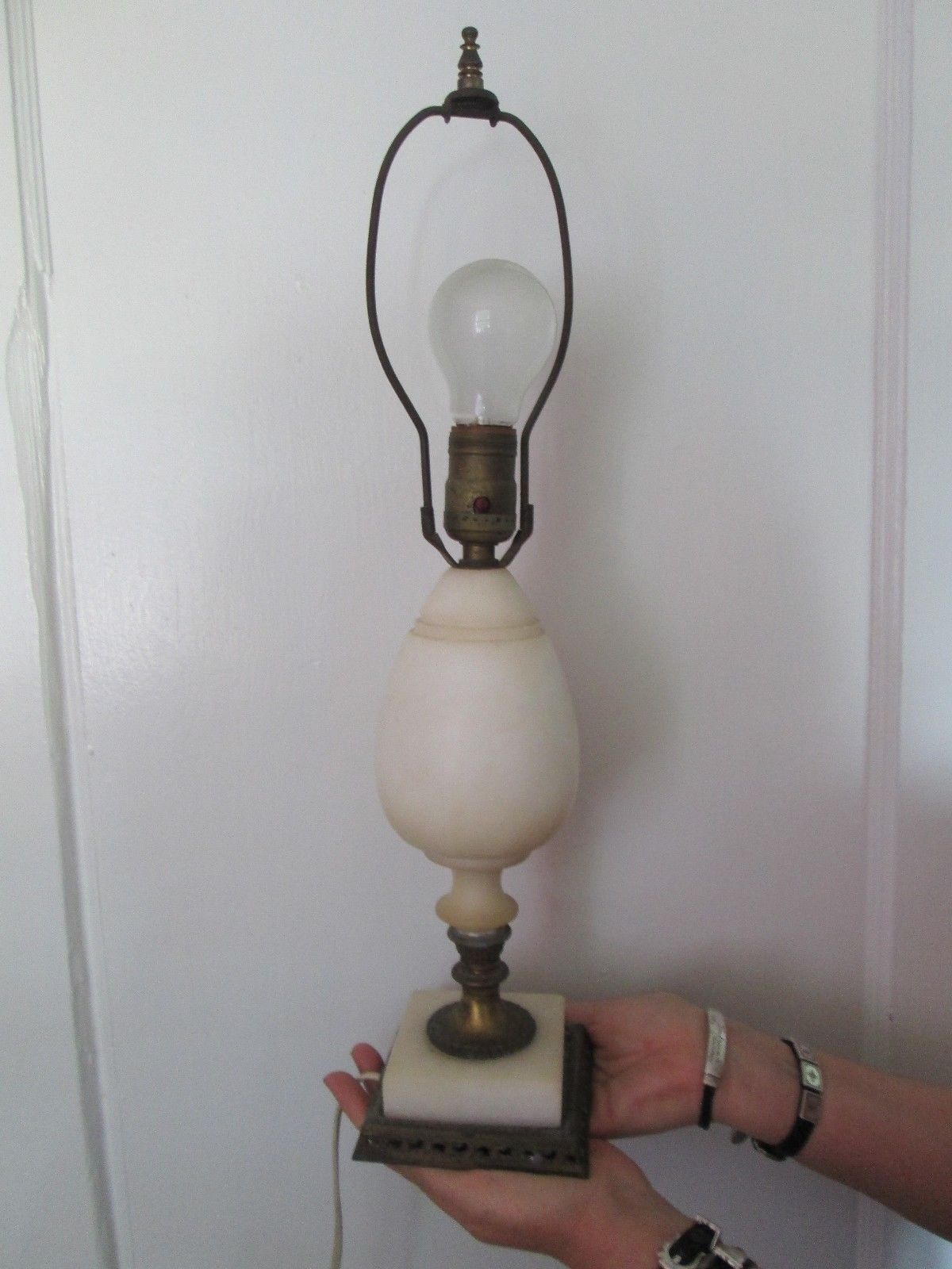 Title (ebay affiliate link): Vintage antique signed SRM NY lamp shades Alabaster egg brass metal base table