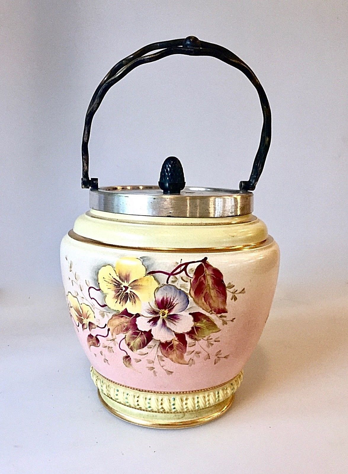 Title (ebay affiliate link): Antique Victorian Painted Ceramic Ginger Cracker Jar with Silverplate Lid