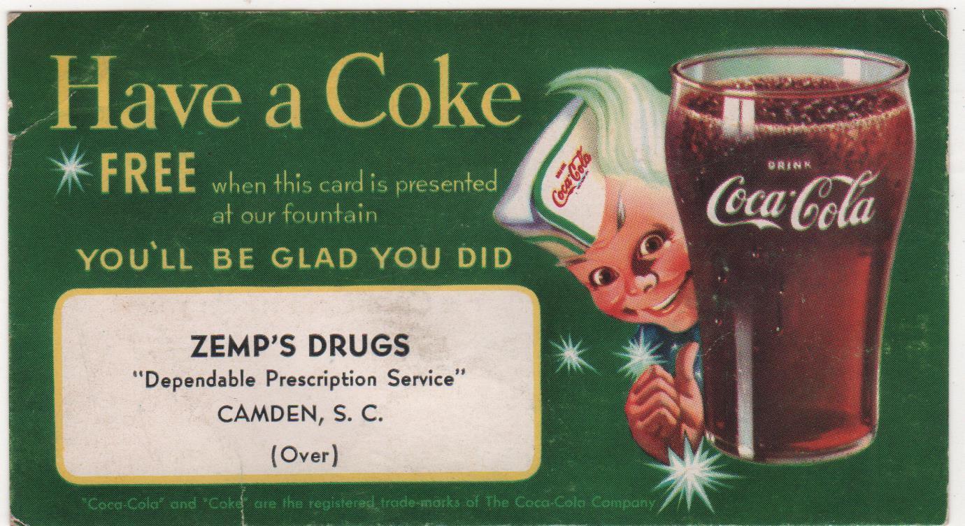 vintage Advertising Card Have a Coke Free Coca-Cola Zemp''s Drugs Camden, S.C.