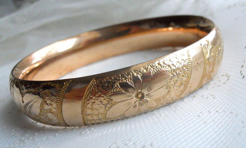 Title (ebay affiliate link): Antique Victorian Wide Embossed FLOWERS Hinged Rose-Gold Filled BRACELET