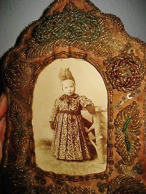 Antique 1880s BEADED WALL HANGING PICTURE FRAME with real photo of little girl