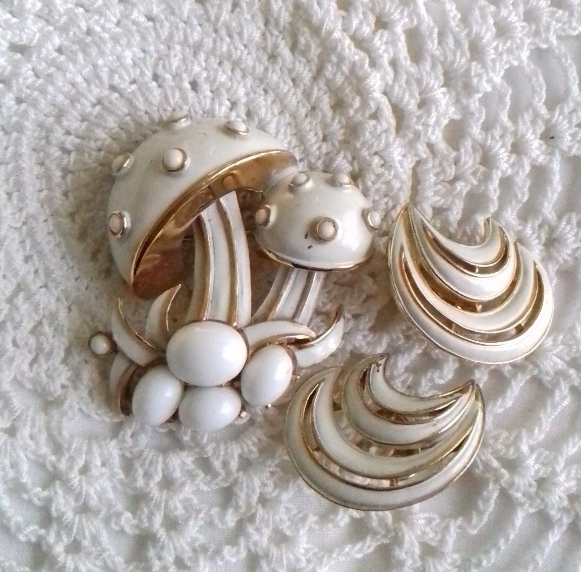 Title (ebay affiliate link): Crown Trifari 1960s White Milk Glass Cabochon & Enamel Gold Plated Demi-Parure