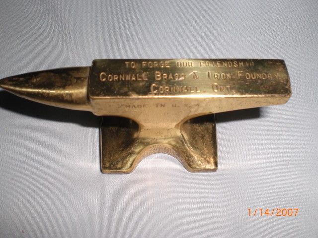 antique brass advertising miniature anvil paperweight Cornwall Brass & Iron Ont