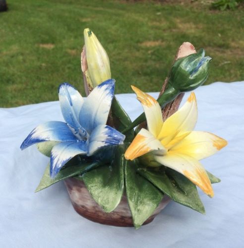 Vintage Capodimonte Blue & Yellow Lilies in Basket/Dish