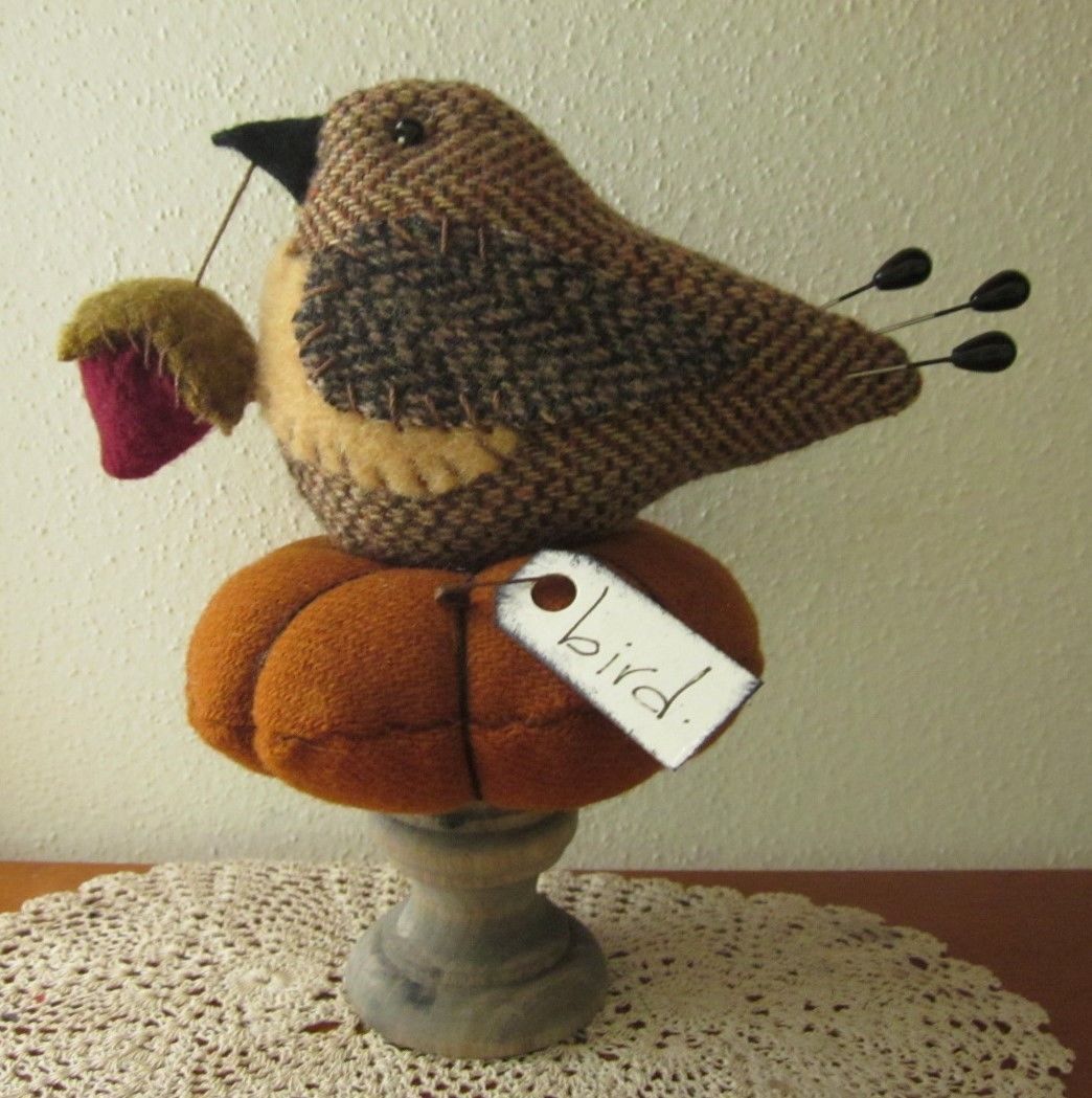 Title (ebay affiliate link): PRIMITIVE WOOL SPARROW WREN BIRD STRAWBERRY PEDESTAL MAKE DO PIN CUSHION PFATT