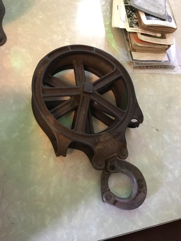 Title (ebay affiliate link): Vtg Cast Iron Louden Hay Carrier Trolley Drop Rope Pulley Wheel Primitive Farm