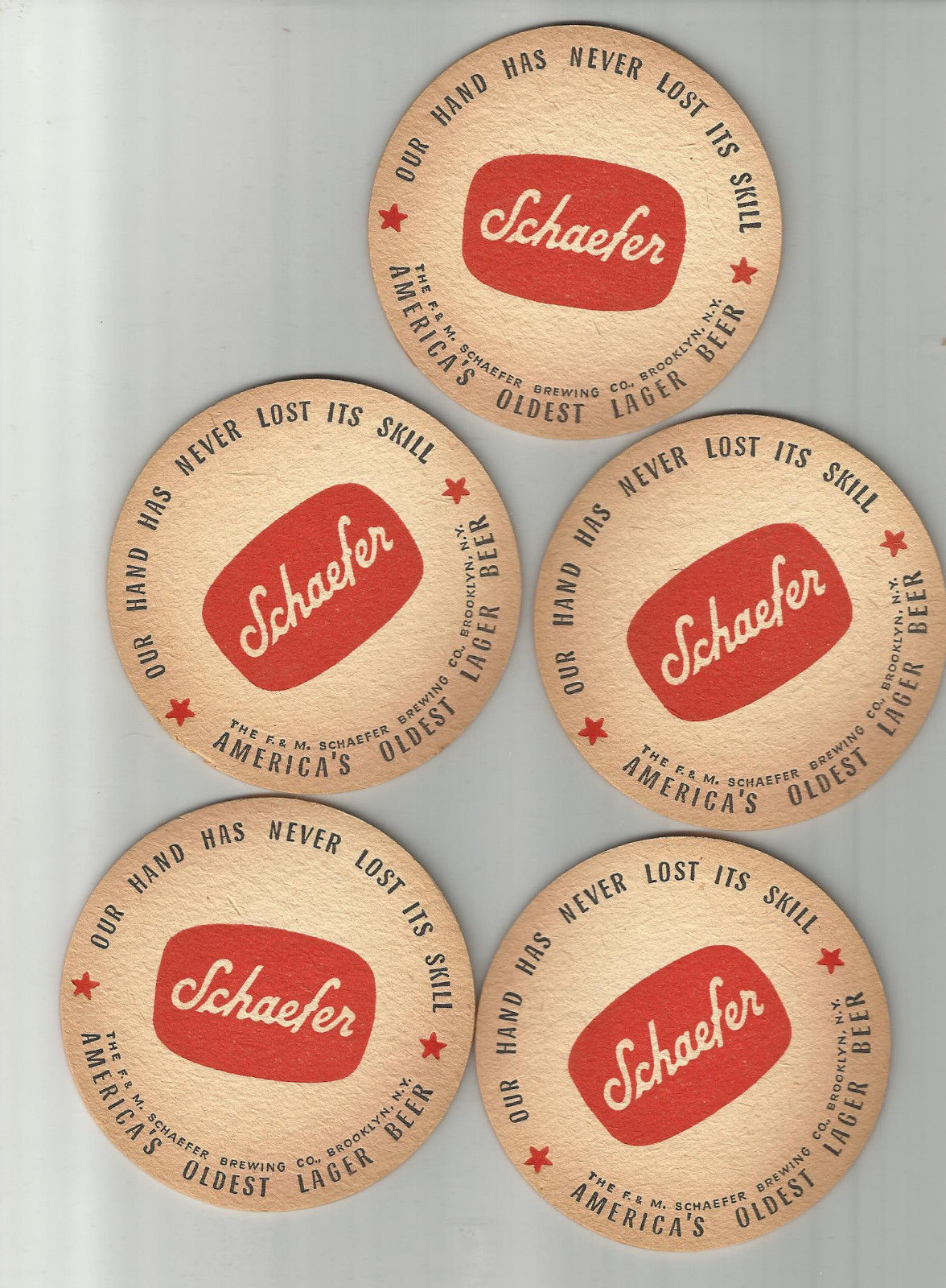 Lot Of 5 1950''s Schaefer Beer Coasters -Brooklyn, NY 3" "Our Hand Has" #024