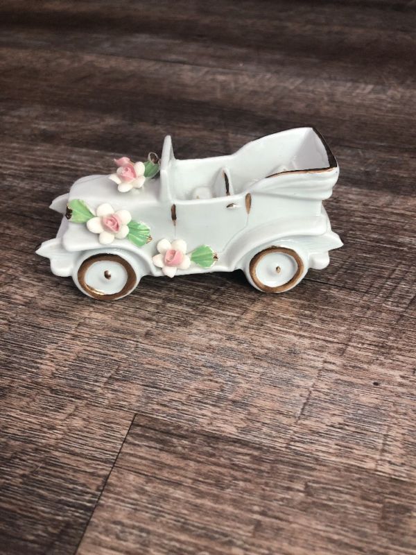 Vintage Nuova Capodimonte White Porcelain Car With Gold Accents And Flowers