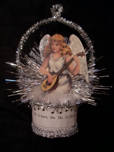 Title (ebay affiliate link): Antique Look Christmas Ornament, MUSIC Angel/Basket, Scrap, Tinsel, Hand Made
