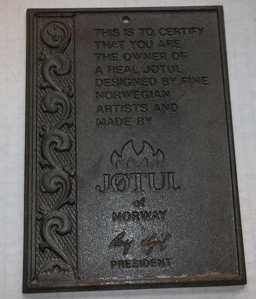 Title (ebay affiliate link): VINTAGE JOTUL of NORWAY STOVE SIGN CAST STEEL & DESIGN Roy Sjol President Signed