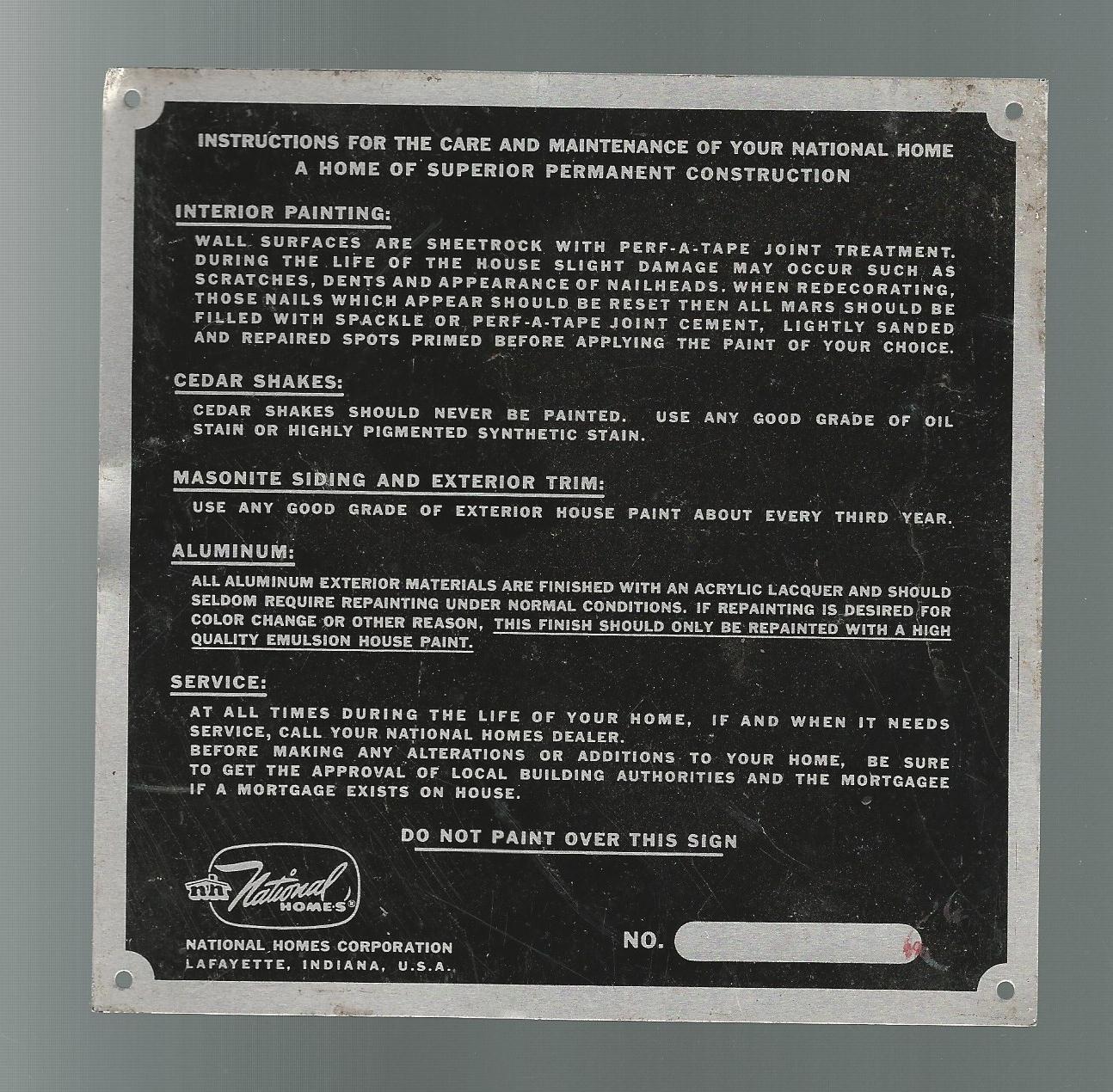 Title (ebay affiliate link): VINTAGE ALUMINUM HOUSE SIGN 1960s NATIONAL HOMES Corp LAFAYETTE INDIANA