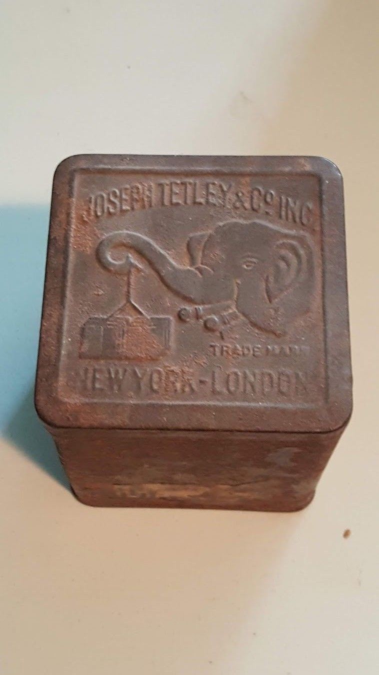 Title (ebay affiliate link): Antique Tetley New York Tin with Great Elephant Logo Including Treasures Inside