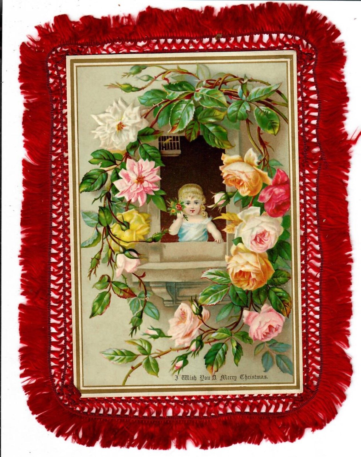 Title (ebay affiliate link): Girl & Baby peeking out of Rose Covered Window. Double-sided, Red Silk Fringed.