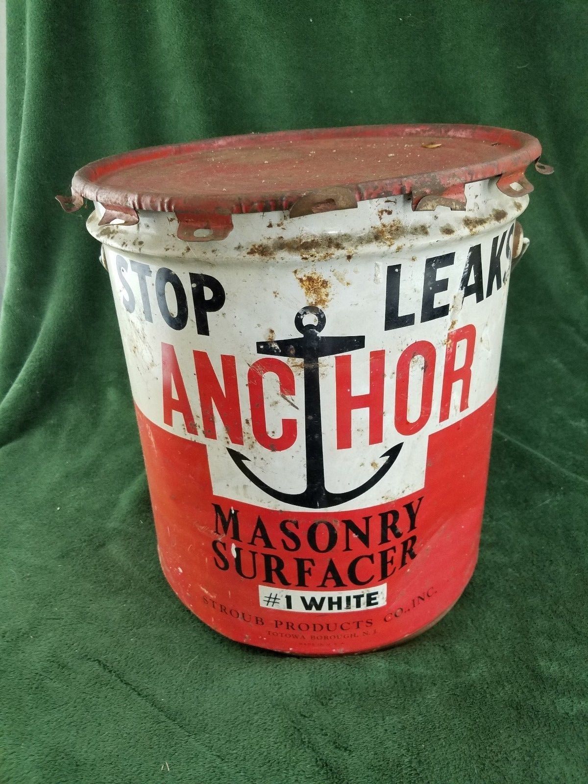 Title (ebay affiliate link): Vintage 60 lb can Stop Leak Anchor Masonry Stroub Products Totowa, N.J. 1950s