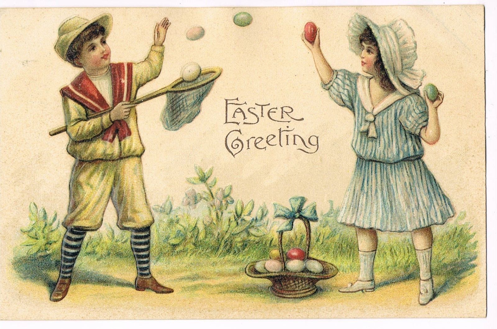 Title (ebay affiliate link): ANTIQUE EMBOSSED EASTER Postcard GIRL TOSSING EGGS, BOY CATCHING THEM IN NET
