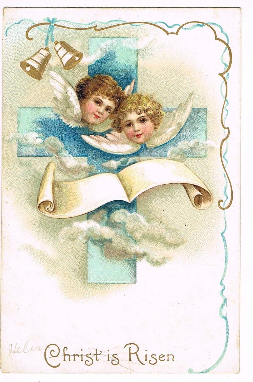 Title (ebay affiliate link): ANTIQUE EASTER Postcard "CHRIST IS RISEN", CHERUBS, CROSS, CLOUDS, BELLS