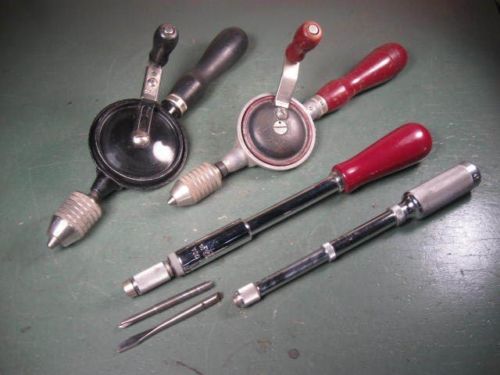 OLD USED VINTAGE STANLEY TOOLS HAND DRILLS PUSH DRILL AND DRIVER FINE GROUP