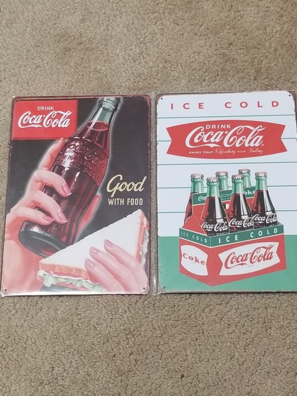 Title (ebay affiliate link): 2 Lot Coca Cola Ice Cold Pack 6 Shield & Good With Food Tin Sign U.S Seller