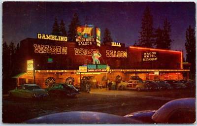 Title (ebay affiliate link): Lake Tahoe, Nevada Postcard WAGON WHEEL SALOON Casino Night View Hwy 50 c1950s