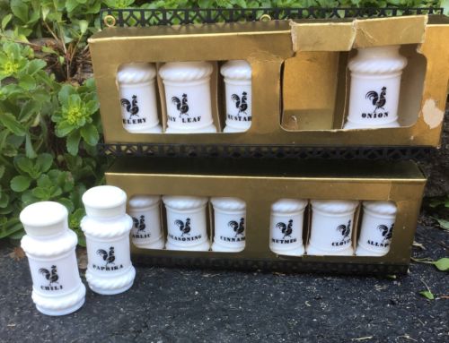 Title (ebay affiliate link): Vtg White Milk Glass Rooster Spice Jars Black Metal Wall Rack 12 jars Never Used