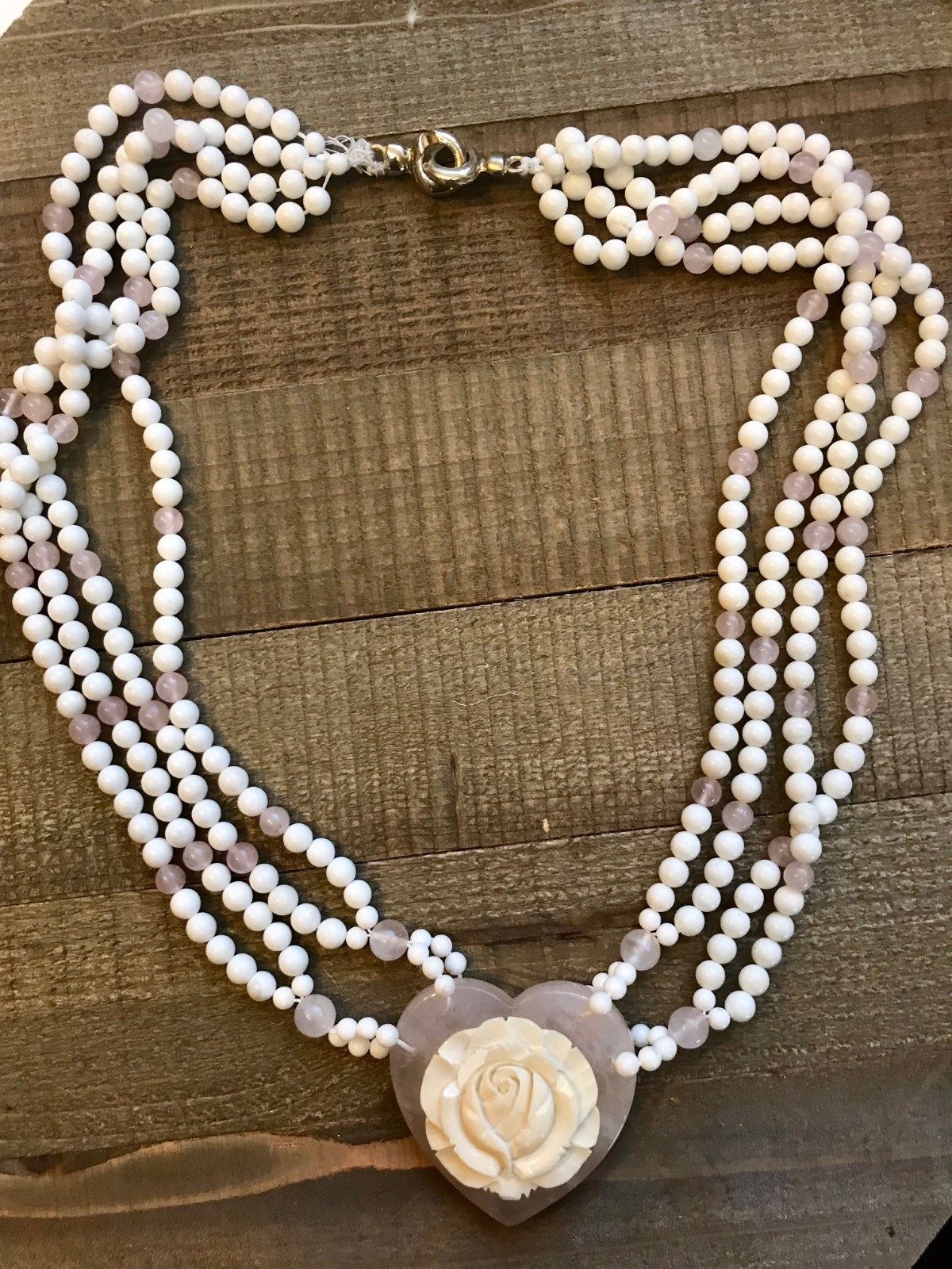 Title (ebay affiliate link): Vintage Rose Quartz Milk Glass Necklace carved Rose Pendant Multi Strands 23 in.