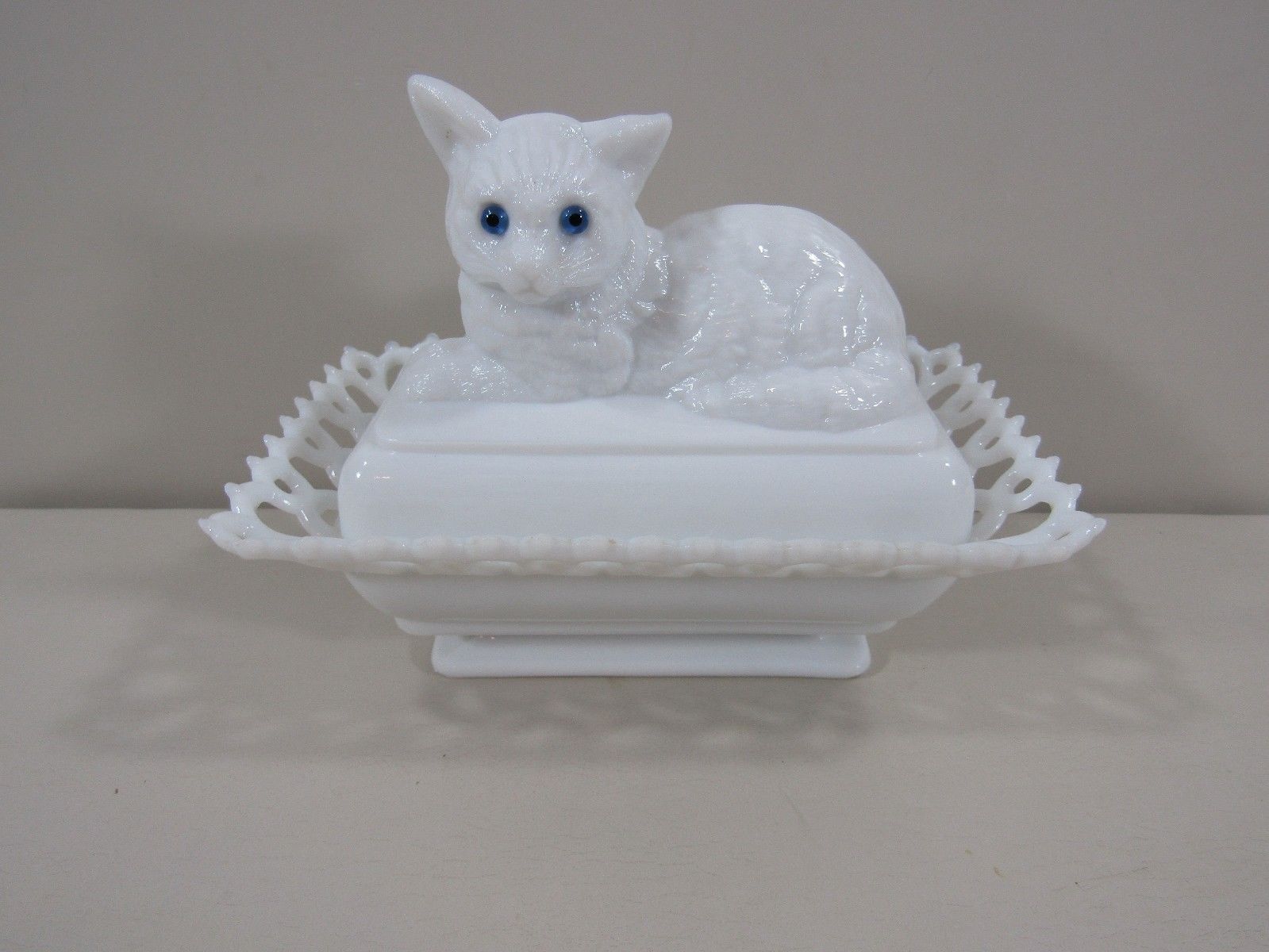 Title (ebay affiliate link): Vintage Westmoreland Milk Glass Cat Covered Lace Edge Box with Blue Glass Eyes