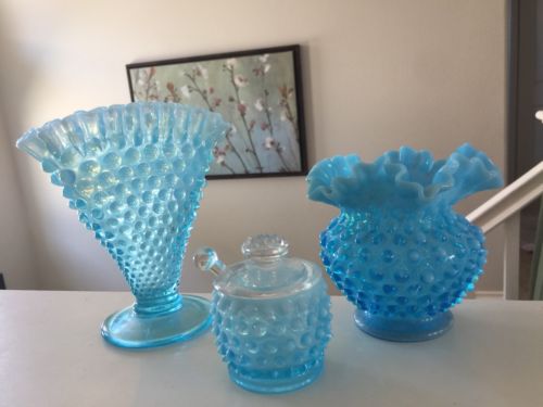 Title (ebay affiliate link): 2 MILK GLASS VASES + RARE Mustard Pot With Scoop - HOB NAIL PATTERN BLUE Vintage