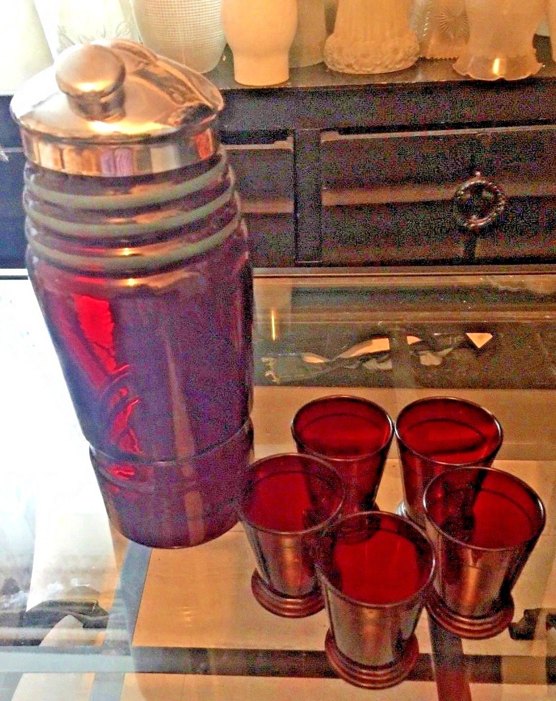 VINTAGE HEAVY CRANBERRY COCTAIL SHAKER WITH 5 SHOT GLASSES