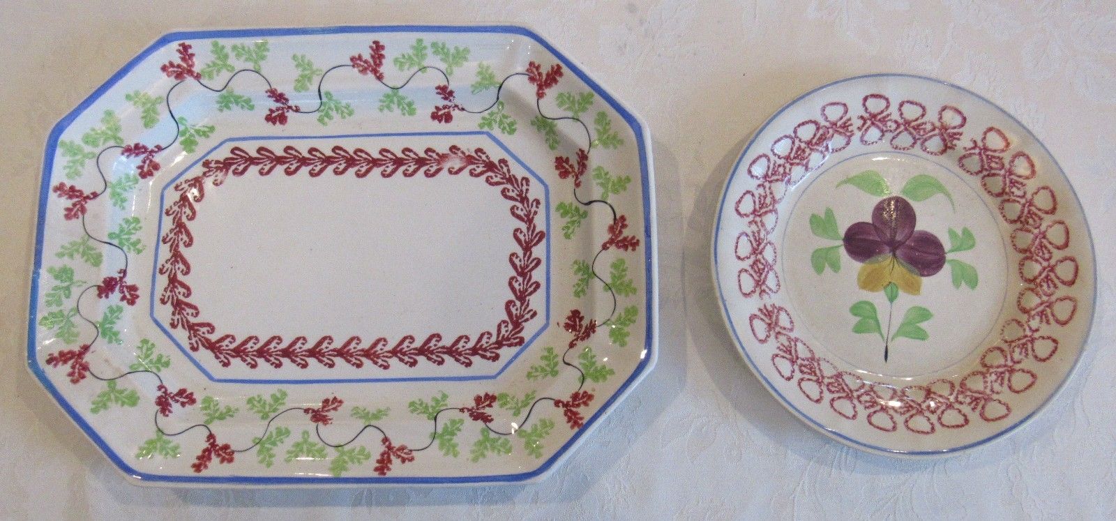 Antique Primitive Staffordshire Stick Spatter Spongeware Holly Platter & Plate