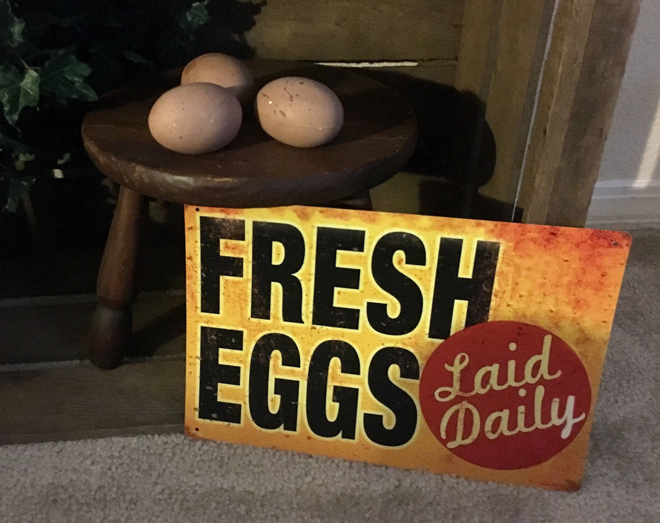 Title (ebay affiliate link): PRIMITIVE VINTAGE metal egg SIGN - FARM FRESH EGGS & 3 Pottery EGGS