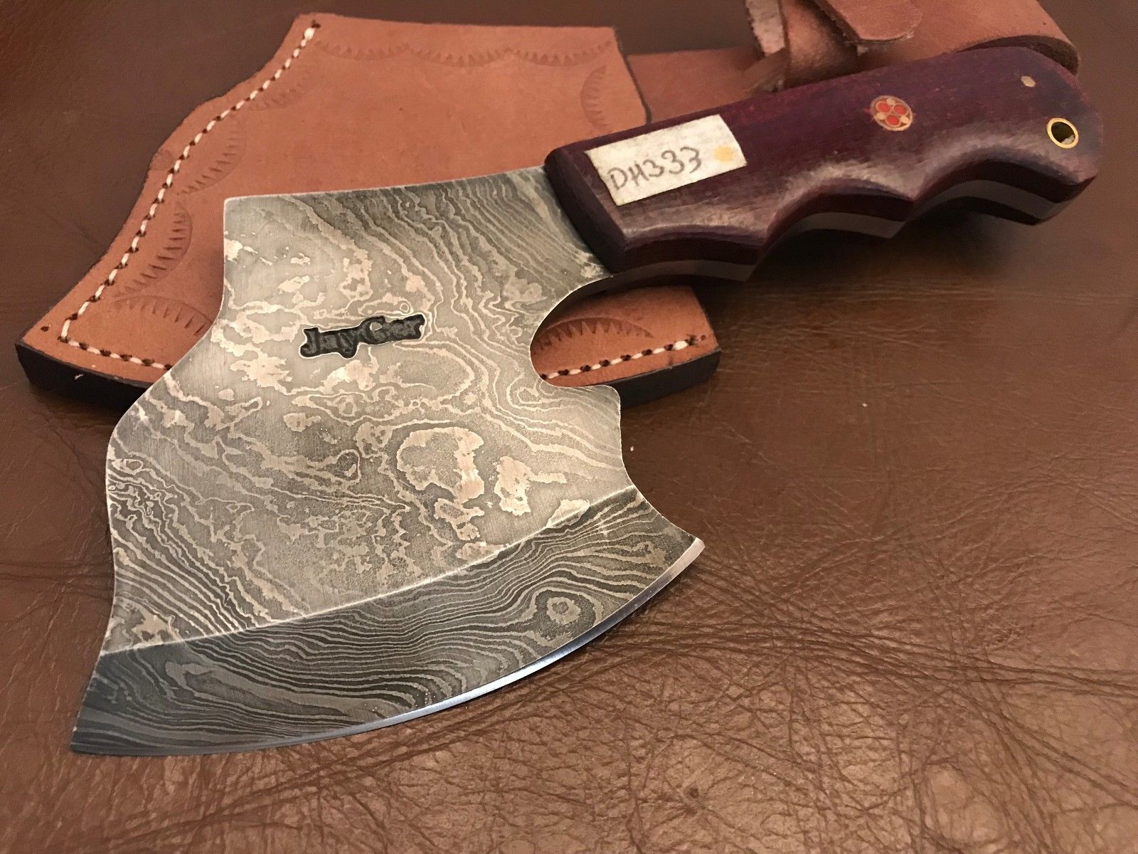 Title (ebay affiliate link): Handmade Damascus Steel Axe-Fully Functional-Camping-Hiking-Sheath-Dh333