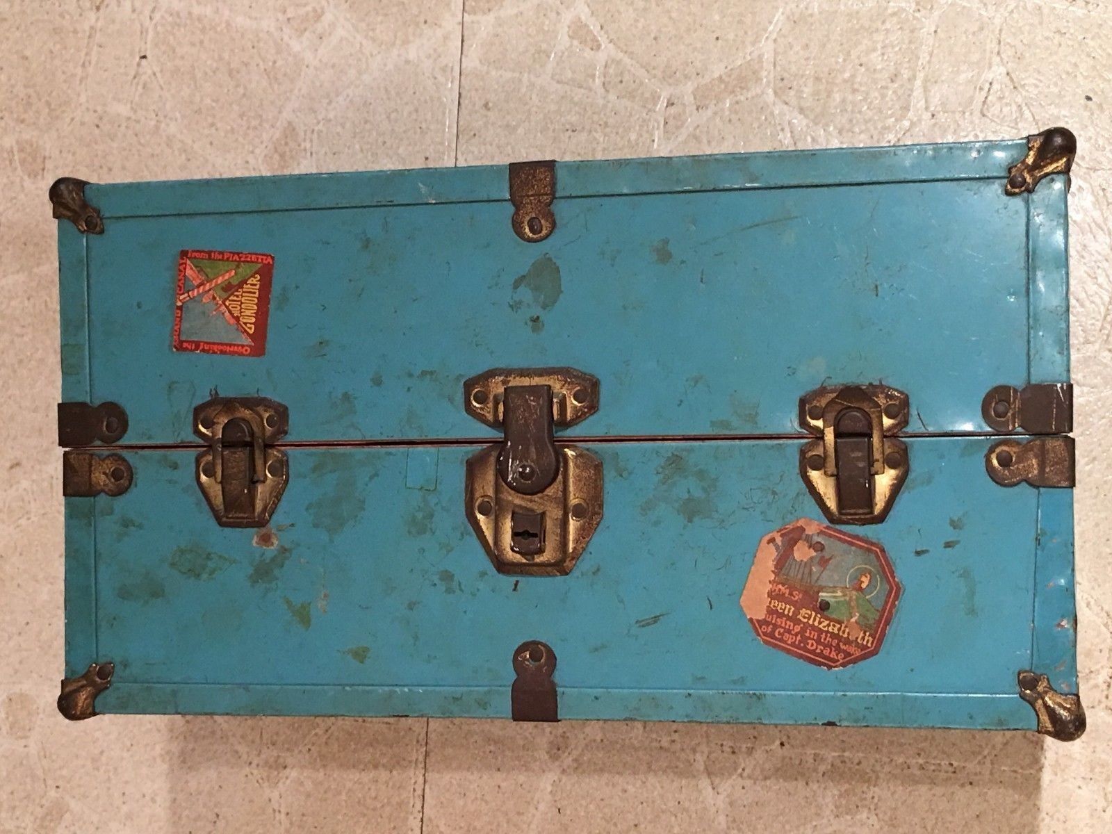 Title (ebay affiliate link): ANTIQUE BLUE ENAMEL METAL DOLL TRUNK 16" X 9" X 9" FOR 11 1/2-12" DOLL