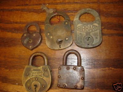 Title (ebay affiliate link): 5 Vintage Padlocks Fraim Hibbard Heart General Har-Mac