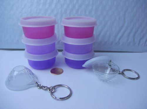 Title (ebay affiliate link): Vintage Tupperware smidget set. Pink & Purple with 2 prisms keychain bowls