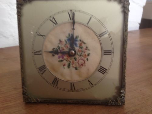 antique wind- up clock with fine needlepoint panel, shabby chic, working