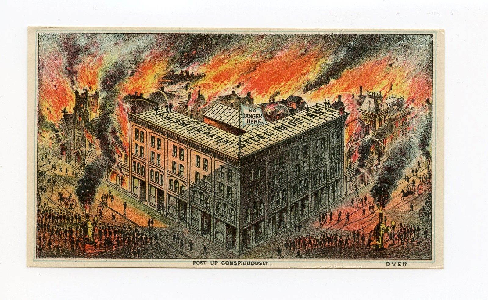 FIRE TRADE CARD 1880''S BURNING BUILDING STEEL ROOF CANTON OHIO VARIATION