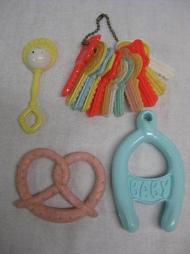 Title (ebay affiliate link): 4 Vintage Plastic Baby Teething Toys - Keys on a Chain, Pretzel, 2 Rattles