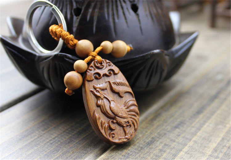 Wood Carving Chinese Zodiac Cock Statue Sculpture Pendant Key Chain