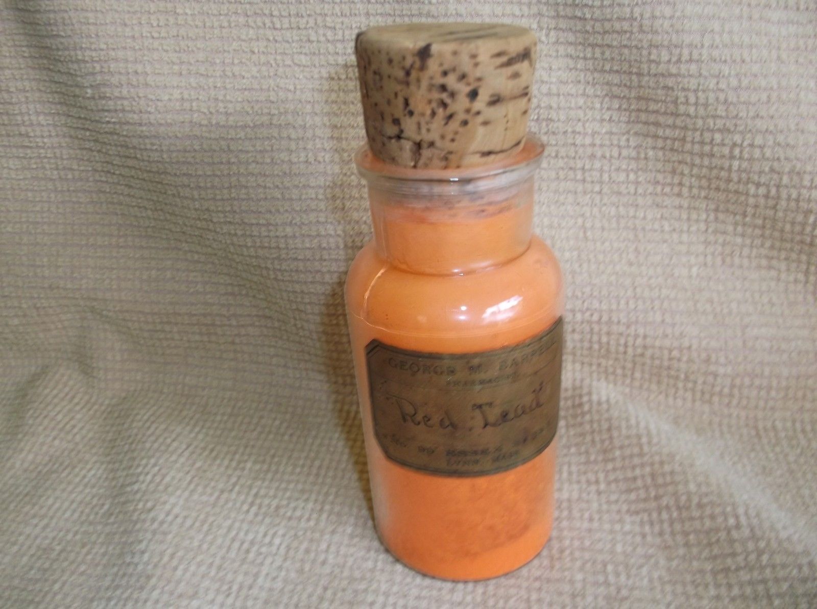 Title (ebay affiliate link): antique amber glass pharmacy bottle w/ label + contents, RED LEAD, pigment, dye