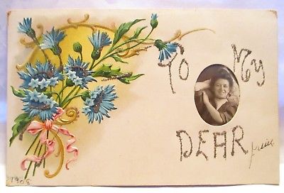 Title (ebay affiliate link): 1908 RISQUE GLITTER FLORAL POSTCARD " TO MY DEAR " W/ REAL PHOTO OF PRETTY GIRL