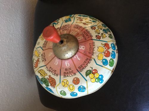 Title (ebay affiliate link): Vintage Tin Wood Handle Spinner Top Toy J. Chein Count''Em Top With Box
