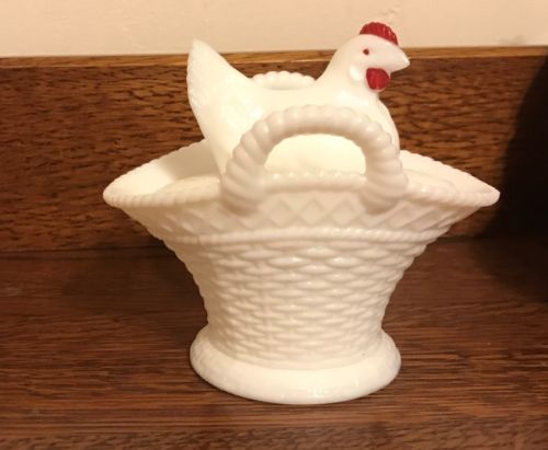 Vintage Milk Glass Chicken Hen on Handled Basket Nest